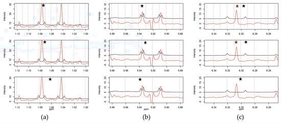 Selected sections of conventional 1H-NMR (black) and PSYCHE (red) spectra of a representative Hypericum perforatum sample evaluated with different bin sizes to display signals at: (a) 1.08 ppm (d, 6.5 Hz) H3-12 of hyperforin (5); (b) 5.94 ppm (d, 2.4 Hz) H-6 of epicatechin/catechin (4); and (c) 6.31ppm (d, 15.8 Hz) H-8′ of chlorogenic acid (1). For each signal, three bin sizes are shown (from up to down: 0.01, 0.02, and 0.04 ppm). The dashed vertical grey line marks the borders of each bin. The chosen bin for evaluation is highlighted with an asterisk.