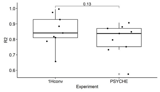 One goal of this analysis was to check if PSYCHE may have advantages in comparison to conventional 1H-NMR, generated by uniform binning. Figure 6 shows the boxplots of the R2 values, generated from the PSYCHE and the conventional 1H-NMR experiments. The R2 values are not significantly different from each other (Wilcoxon–Mann–Whitney, p > 0.05). However, the data from conventional 1H-NMR tend to reach slightly higher R2 values. This indicates that the PSYCHE experiment has no advantage in terms of quantification during the binning process.