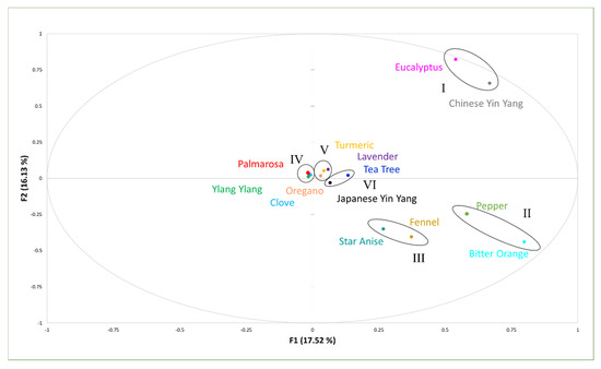 Based on the PCA analysis, the 14 EOs studied were grouped into six different clusters, which allowed to distinguish six chemotypes as shown in Figure 1. The first group (I) includes eucalyptus and Chinese yin yang, both characterized by a high content of eucalyptol, whereas the second one (II) was made up of bitter orange and pepper, which contains high percentage of D-limonene. Cluster III groups together star anise and fennel, based on the high quantity of anethole. Group IV was clustered by the presence of sesquiterpenes and was composed by cloves, palmarosa, and ylang ylang. Furthermore, it was observed that the EOs of turmeric, lavender, and oregano (Group V) were clustered because of the presence of eucalyptol and o-cymene. In the same way, the similarity between tea tree and Japanese yin yang can be observed (Group VI) due to the high relative percentage of the components eucalyptol and d-limonene.