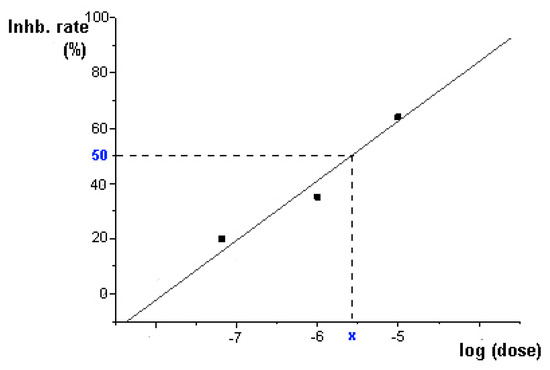 As shown in Figure 3, most dose–response curves were generated using at least three concentrations of the compound with inhibitory rate, and the IC50 values were calculated by least-square analysis of the linear portion of the log(dose) versus response curves (r2 > 0.95), with equation IC50 (μM) = 10 x + 6. The experiments were performed in triplicate.