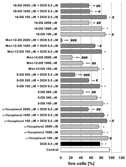 53]. Simultaneously, so far, the influence of various DSs applied together with DOX on the cell toxicity has not yet been investigated in detail. In some studies, DSs were used as tools in EPR technique, e.g., 5-DS and 12-DS were utilized to measure changes in lipid membrane fluidity induced by DOX in isolated rat cardiac mitochondria [