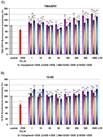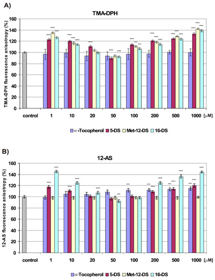 33]. In our study, α-Tocopherol, in comparison with DSs, displayed a weaker influence on membrane fluidity and induced its decrease only in the hydrophobic core.