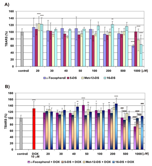 30]. However, in our study, only the highest concentration (1000 μM) of α-Tocopherol, applied alone, acted protectively and significantly reduced the level of LPO in B14 cells. Similarly, α-Tocopherol acted as an antioxidant and inhibited LPO induced by DOX only at the highest concentrations (500 and 1000 μM).