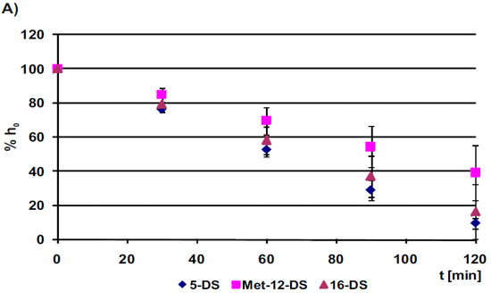 48], in our study, we could expect the nitroxyl moiety of Met-12-DS in the region rich in double bonds of unsaturated fatty acids of lipids. This assumption was confirmed in our investigation by interactions of Met-12-DS with 12-AS fluorescent probe in the measurements of lipid membrane fluidity. Further, the nitroxyl moiety of 16-DS should have the maximum of distribution at the depth of saturated hydrocarbon chain fragments, and its motion is almost isotropic, while the 12-DS probe shows more anisotropic motion. Analogous differences were recorded for probes 12PC and 16PC at 5 °C. On the other hand, at 37 °C, the disappearance of anisotropic motion was detected; spectra of both probes were very similar and represented their isotropic motion [