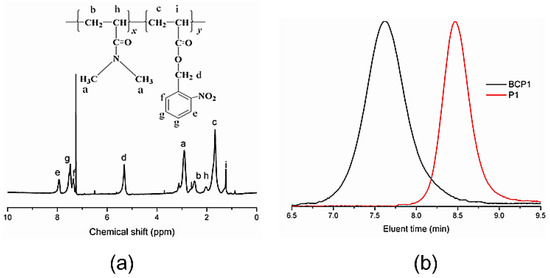 Characterization of PDMA30-b-PNBA97: (a) its 1H-NMR spectrum in CCl3D; and (b) the GPC elution curve in THF using polystyrene standards for calibration. CCl3D: chloroform-d; THF: tetrahydrofuran.