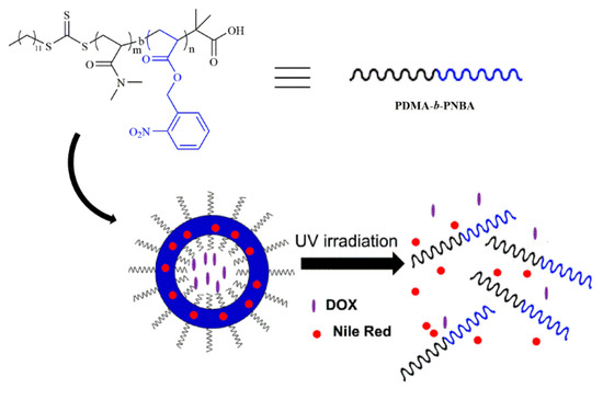 Herein, we present one solution to prepare an amphiphilic block copolymer with pure poly (o-nitrobenzyl acrylate) (PNBA) as the hydrophobic block and poly (N,N’-dimethylacrylamide) (PDMA) as the hydrophilic block by bulk RAFT polymerization of o-nitrobenzyl acrylate using a PDMA macro-RAFT agent (PDMA–CTA). Shown in Scheme 1, photoresponsive polymersomes can be fabricated from self-assembling of the developed amphiphilic block copolymers and used to co-load hydrophobic and hydrophilic cargos into hydrophobic membranes and aqueous compartments of the polymersomes. Upon UV light irradiation, the hydrophobic block is transformed into an hydrophilic one in the photocleavage reaction of o-nitrobenzyl groups, thereby resulting in dissociation of the polymersomes with simultaneous co-release of both hydrophilic and hydrophobic cargoes. While the UV light could limit its application to a certain extent, many kinds of drug delivery systems respond to the UV irradiation, which has been prepared and studied in lots of labs [26,32,33]. We have reason to believe this unique on-demand releasing characteristic provides a noninvasive drug releasing strategy and could be applied in many clinical areas such as medical imaging and targeted therapy.