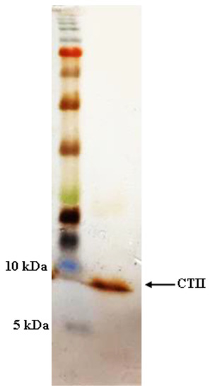 As mentioned in the previous research, the protein of interest was cleaved according to the SUMO Protease manufacturer’s instrument (Thermo Fisher Scientific, San Jose, CA, USA). The rCTII was purified by using the Ni-NTA column. Then, the concentration of rCTII was assessed by the Bradford method. Assessment of the size and purity of the rCTII was evaluated by protein separation in 12% sodium dodecyl sulfate-polyacrylamide gel electrophoresis (SDS-PAGE) and subsequent staining with silver nitrate [6].