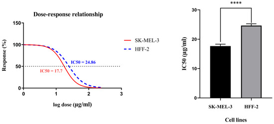 Figure 3 displays the viability curves of the cell dose–response for rCTII in SK-MEL-3 and HFF-2 cells. The MTT assay indicated that rCTII inhibits cell proliferation in a dose-dependent manner. In the SK-MEL-3 cancer cell line, the half maximal inhibitory concentration (IC50) value of rCTII was 17.7 µg/mL; however, the IC50 value of rCTII was approximately 24.76 µg/mL in the HFF2 cell line. The higher IC50 values of rCTII in non-tumoral cells compared to melanoma cells are illustrated in Figure 3 (p < 0.0001).