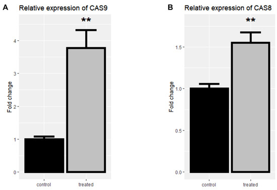 The relative mRNA expression of Casp-9 (A) and Casp-8 (B) in the SK-MEL3 cell line after treatment with 17.7 µg/mL rCTII. The expression of candidate genes was assessed by real-time PCR in the control and treated group. Our result illustrated that this protein potentially activated both intrinsic and extrinsic pathways related to apoptosis. Error bars display the ± SD. The independent t-tests assessed the p-values. p < 0.01 (**).