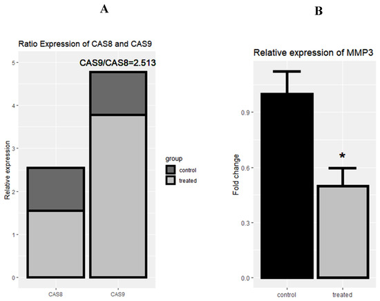 Following the treatment of cells with rCTII, caspase-8 and caspase-9 were significantly increased in the SK-MEL-3 cells line (both p < 0.01) (Figure 4A,B). After treating melanoma cells with rCTII, the ratio of caspase-8/caspase-9 was 2.513, highlighting the dominance of the intrinsic pathway of apoptosis (Figure 5A). Compared to untreated malignant cells, there was a significant down-regulation in the expression level of MMP-3 in treated malignant cells (p < 0.05) (Figure 5B).