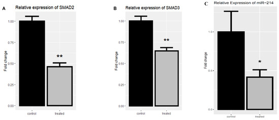 The relative mRNA expression of SMAD2 and SMAD3 after the treatment with 17.7 µg/mL rCTII in the SK-MEL-3 cell line (A,B). The expression level of miR-214 after the treatment with rCTII (C). The expression of candidate genes was assessed through real-time PCR in the control and treated group. Our result demonstrated that for the rCTII protein, the SMAD2 and SMAD3 expression levels were evaluated in the treated and untreated cell line to investigate the rCTII effect on the transforming growth factor-beta (TGF-β) signaling pathway. After melanoma cells were treated with rCTII, there was a significant down-regulation in the expression level of SMAD2 and SMAD3 compared to untreated melanoma cells (both p < 0.01). Subsequent to cancerous cells being treated with rCTII, there was a significant reduction in the expression level of miR-214 compared to untreated melanoma cells (p < 0.05). Error bars display the ± SD. The independent t-tests assessed the p-values. p < 0.05 (*), p < 0.01 (**).