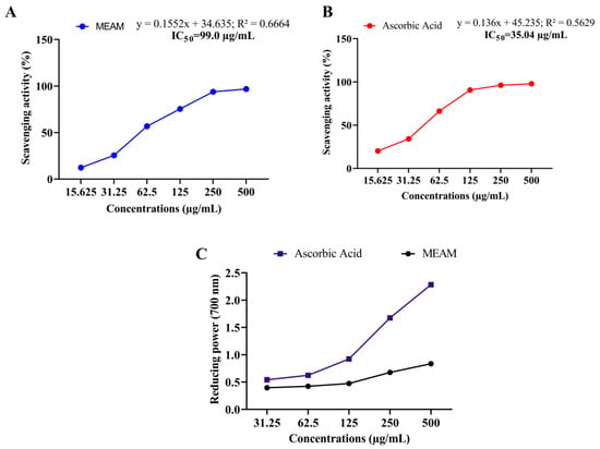 MEAM’s free-radical scavenging activity was determined by using the DPPH method for discerning the radical scavenging capacity [