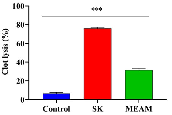 37]. Both MEAM and streptokinase exhibited a moderate degree of clot lysis in comparison with in the control group as depicted by our recent findings. The leaves of MEAM were previously reported [