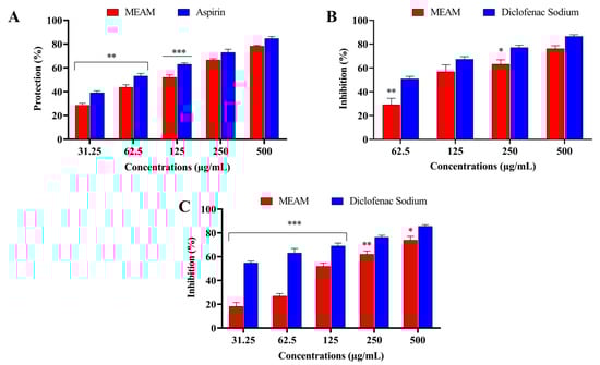 70]. The reaction mixture (0.5 mL) consisted of BSA (0.45 mL), MEAM (0.05 mL), and standard solution at different concentrations (31.25, 62.5, 125, 250, and 500 µg/mL), while diclofenac sodium was used as a standard. The sample was hatched for 20 min at 37 °C and again retained for 30 min at 57 °C. In addition, 2.5 mL of phosphate buffer were applied to the previous solutions and spectrophotometer absorption was estimated at 660 nm, with distilled water used as a test control. The test was conducted in triplicate and the percentage of protein-denaturation inhibition was calculated as follows: