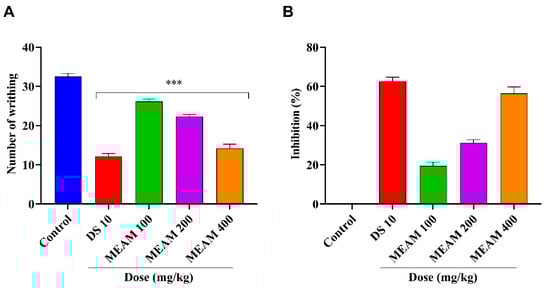 51]. During the writhing test, MEAM and the standard drug diclofenac sodium showed a significant (