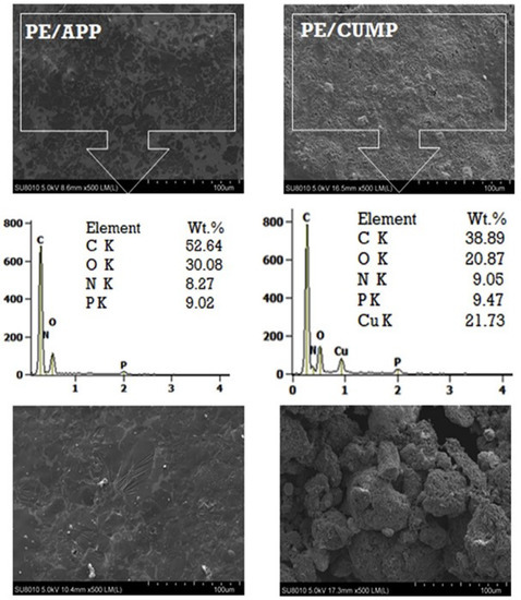 Melamine (MLM) is another unique material containing 67 wt.% nitrogen and excellent thermal resistance, which could be combined with phosphorus compounds used in FR applications. Among the MLM-containing compounds, MLM phosphate is specific due to the presence of phosphorus. Other commercially available MLM-based FRs are melamine cyanurate (MC), melamine pyrophosphate (MP), and melamine polyphosphate (MPP). Moreover, MLM can form salts with high thermal stability and strong acids. Salasinksa et al. [4] evaluated the effect of incorporating copper phosphate and melamine phosphate (CUMP) into HDPE as a FR compound and compared it with HDPE/APP. The fire property of HDPE containing CUMP was carried out by CCT. Figure 1 indicates the scanning electron microscope (SEM) images of PE/APP and PE/CUMP formed char layer, as well as char chemical composition.