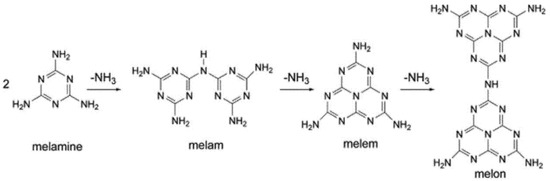 Chemical structure of the condensates produced through endothermic thermal decomposition of the melamine, reprinted with permission from Ref. [55].