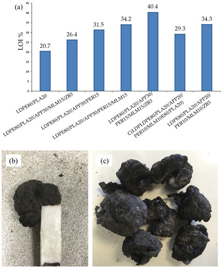 Arslan et al. [66] investigated the result of using metal hydroxide, ZB, MLM, APP, and PER as reinforcements to improve flammability of LDPE/Polylactic acid (PLA). The efficiency of flame retardancy of the composites was evaluated by LOI analysis. The results showed the higher LOI values for samples containing MLM, APP, and PER. The LOI values of LDPE/PLA/ZB, LDPE/PLA/AH, LDPE/PLA/MH, LDPE/PLA/MLM, and LDPE/PLA/APP were 21.3, 20.2, 21.4, 20.4, and 22.3, respectively. As can be observed, the compound of ZB, AH, MH, and MLM indicated a negative impact on flammability of the LDPE/PLA blend. The highest value of LOI analysis was attributed to LDPE/PLA/APP30/PER15/MLM15/ZB3 composite with 95.17% improvement in comparison to the LDPE/PLA blend. The best flame retardancy results were reported in Figure 3a. It is crystal clear that APP is the most effective FR, which significantly promoted the flame behavior of LDPE/PLA. In addition, APP/MLM/PER incorporation considerably increased the strength and integrity of the char layer due to the promotion of phosphor and oxygen. Figure 3 demonstrates the images of char layer after LOI analysis and char residue of LDPE/PLA/APP/MLM/PER composite.
