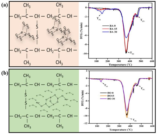 Effect of the boron compound additive on cross-linking and DTG curves of the NR/LDPE/HAF (100/10/30) with varying loadings (0–30) of (a) BA, and (b) borax (BO), reprinted with permission from Ref. [103].
