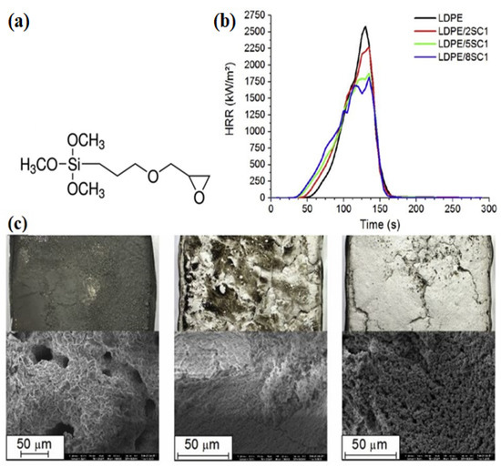 (a) Chemical structure GOPTMS; (b) Burning behavior of the LDPE-based systems in which various loadings of SC1 incorporated; and (c) Surface and microscopic structure of the fire residue in LDPE/SC1, LDPE/MH, and LDPE/SC1/MH composites (from left to right), adapted with permission from Ref. [81].
