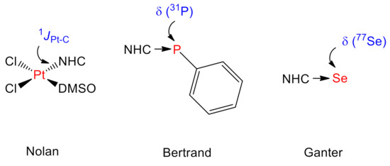 - Vummaleti, S.V.; Nelson, D.J.; Poater, A.; Gómez-Suárez, A.; Cordes, D.B.; Slawin, A.M.; Nolan, S.P.; Cavallo, L. What can NMR spectroscopy of selenoureas and phosphinidenes teach us about the π-accepting abilities of N-heterocyclic carbenes? Chem. Sci. 2015, 6, 1895–1904. [Google Scholar] [CrossRef]