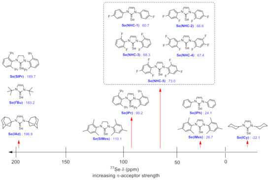 - Liske, A.; Verlinden, K.; Buhl, H.; Schaper, K.; Ganter, C. Determining the π-acceptor properties of N-heterocyclic carbenes by measuring the 77Se NMR chemical shifts of their selenium adducts. Organometallics 2013, 32, 5269–5272. [Google Scholar] [CrossRef]
