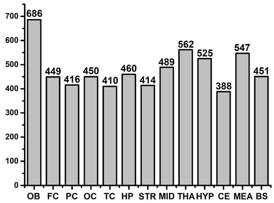 Finally, a total of 1008 potential FFAs were found in the whole brain. Detailed information is provided in Table S1. Among different brain regions, the following number of FFAs were detected: 686 in the OB, 449 in FC, 416 in PC, 450 in OC, 410 in TC, 414 in STR, 562 in THA, 525 in HYP, 489 in MID, 388 in CE, 460 in HP, 451 in BS, and 547 in the medulla. Furthermore, the number of FFAs of all brain regions are summarized in Figure 2. The OB has more free fatty acids than all the other regions and is an important part of the olfactory system especially for rodents. Rodents’ feeding and reproduction are dependent on the olfactory bulb. There are various cell subtypes to handle the variety of information received from the environment. It could be hypothesized that this large amount and various types of FFAs are probably needed to form various molecules to fulfil the higher demand on the OB as compared to the other regions.