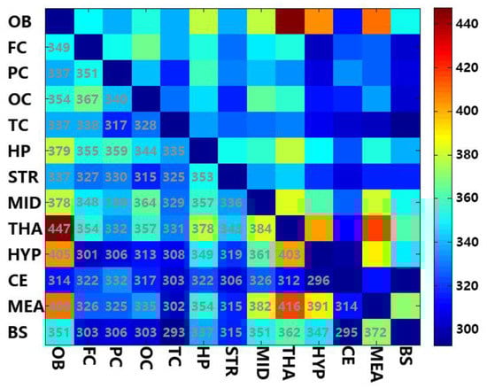 However, we cannot deny the fact that these regions have more fatty acids within them, which makes it easier to match more fatty acids with the other regions. Thus, the ratio of the number of A region divided by common FFAs amounting to between A and B is more likely to show a similarity to A region and B region. Figure 4 shows the percentage of common fatty acids between two different regions divided by the vertical shaft region’s potential fatty acids. For instance, 0.78 from the first column and second row in Figure 4 means the common FFAs between FC and OB are 78% of the FFAs in FC. The common FFAs are 51% of the FFAs in OB (first row and second column in Figure 4). We demonstrated that the OB and most of the other regions have a higher proportion of common fatty acids vs. the region being compared, while they have a lower proportion vs. the OB. Nearly all regions and CE have a higher proportion of common fatty acids vs. CE. This may be due to the fact that the OB has the most abundant free fatty acids compared to the other regions, while CE has the least. This factor can also explain why common free fatty acids of OB vs. THA, HYP, and MEA are apparently more than others.