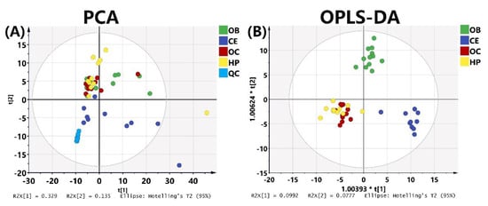 (A) Principal component analysis (PCA0 score plot of 4 brain regions (R2X = 0.749, Q2 = 0.541). (B) Orthogonal partial least squares–discriminant analysis OPLS-DA score plot of 4 brain regions (R2X = 0.698, R2Y = 0.88, Q2 = 0.71). Red dots represent OC; green dots represent OB; yellow dots represent HP; dark blue dots represent CE; light blue dots represent QC.