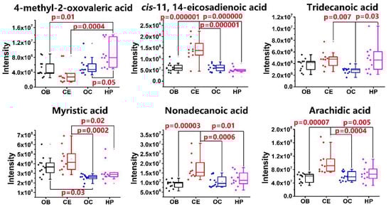 Relative concentration alternation of free fatty acids in 20 mg of rat. Boxplots and scatter plots of six significantly altered FFAs. p values were calculated by one-way ANOVA.