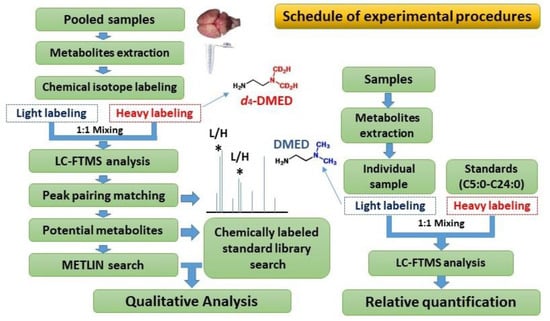 A total of 12 different cerebral regions and medulla of rats were selected as study materials. The CIL-LC-MS technique was employed for qualitative and quantitative investigation of the variations in types and contents of FFAs in different brain regions. A pair of isotopic probes (2-dimethylaminoethylamine (DMED) and d4-2-dimethylaminoethylamine (d4-DMED)) containing carboxylic acid reactive group, were used to label free fatty acids, based on amidation. The detailed workflow of the current work is shown in Figure 7.