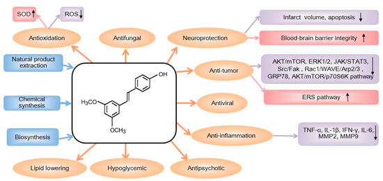 An outstanding drug should have excellent bioactivities and appropriate pharmacokinetic parameters. Pterostilbene is characterized by low molecular weight (Figure 1) and good liposolubility, allowing it to easily cross the blood-brain barrier [16]. Experiments showed that pterostilbene can be rapidly absorbed and is widely distributed in the body. It has suitable metabolic stability and bioavailability [17,18], indicating its suitable pharmacokinetic characteristics. In addition, most available data in human and animal models show that pterostilbene has no significant toxic effects [19,20]. Therefore, pterostilbene is a potential natural small-molecular medicine with a good development prospect. This article reviews the progress in pterostilbene synthesis, bioactivities, and partial mechanisms and certain drug metabolism characteristics in vitro and in vivo. This review provides advantageous information for the comprehensive study of the pharmacokinetic features and the mechanisms underlying the bioactivity of pterostilbene.