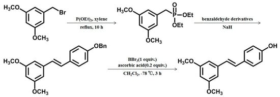 (1) Pterostilbene was synthesized from 3,5-disubstituted benzyl bromide by Arbuzov, Wittig–Horner reaction and deprotection. Among them, boron tribromide and ascorbic acid were used in the process of deprotection, and the use of ascorbic acid can reduce the occurrence of polymerization in the process of deprotection (Scheme 1) [23]. This method has some shortcomings, such as purification and separation difficulties, high environmental pollution, and low synthesis yield.