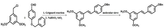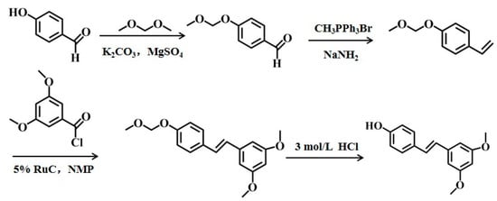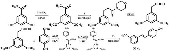 (2) Pterostilbene was obtained from 3,5-dihydroxyacetophenone by methylation, rearrangement, perkin reaction, and decarboxylation-isomerization reaction (Scheme 2) [24]. Impurities were formed, and the yield was low due to the high decarboxylation temperature.