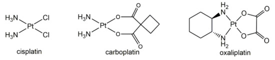 Chemical structure of cisplatin, carboplatin, and oxaliplatin.