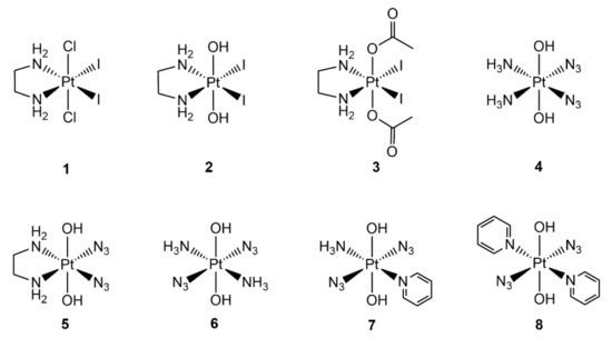 Chemical structures of iodoplatinum(IV)–amines 1–3 and diazido Pt(IV) complexes 4–8.