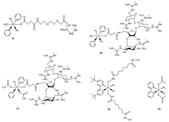 The success of the diazido Pt(IV) photoactivatable prodrug stimulated scientists to further optimize them to enhance the cancer cell-targeting properties or cytotoxicity. Complex 8 was the most potent one, so several derivatives were developed based on it. Marchan et al. conjugated a cyclic pentapeptide containing the RGD sequence c(RGDfK) to the axial OH group of complex 8 by using succinic acid as a linker to yield the Pt(IV)–peptide conjugate complex 9 (Figure 3). The c(RGDfK) is capable of binding to the αvβ3 integrin receptor, which is overexpressed in several cancer cell lines. The irradiation of complex 9 in the presence of 5′-GMP led to the formation of Pt(II)–GMP as the major product, which was similar to that of complex 8. This result suggested that the esterification of the axial OH group did not alter the photochemical properties of complex 8. Complex 9 showed 4-fold higher cytotoxicity in SK-MEL-28 cells (integrin receptor-positive human melanocarcinoma) compared with in DU145 cells (integrin receptor-negative human prostate cancer cells) under irradiation with blue light (λ = 420 nm). Further studies verified that the accumulation of platinum in SK-MEL-28 cells was higher than that in DU145 cells after treatment with complex 9. This work highlighted that the cancer-targeting group was able to enhance the selectivity of the photoactivatable diazido Pt(IV) complexes. Lately, the same research group designed complex 10 (Figure 3) by replacing the c(RGDfK) peptide in complex 9 with guanidinoneomycin [50]. Guanidinoneomycin is a known RNA binding ligand and is able to transport bioactive molecules into cells in a proteoglycan receptor-dependent manner. The guanidinoneomycin vector might potentially lead to the platination of RNA over DNA by complex 10 under irradiation, which will result in a novel mechanism of action. The photoactivation of complex 10 in the presence of 5′-GMP mirrored the results of the parent complex 8 with the formation of Pt(II)–GMP adducts. The incorporation of guanidinoneomycin enhanced the cellular accumulation of the Pt(IV) prodrug in the SK-MEL-28 melanoma cells (about 4-fold) compared with the parent complex 8. However, the photocytotoxicty of complex 10 in SK-MEL-28 cells was similar to that of the parent complex 8, indicating the different mechanisms of action for complexes 10 and 8. Notably, the replacement of an azido group and the axial hydroxy group by trifluoroacetate was observed during the step-wise synthesis of complex 10. The trifluoroacetated analog 11 (Figure 3) also formed Pt–GMP adducts in the presence of 5′-GMP under visible light irradiation. This accidental finding provided a new strategy for the design of novel monoazido-containing Pt(IV) photoactivatable complexes.