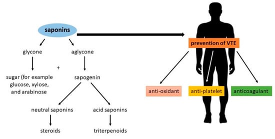 Saponins are amphipathic glycosides that exhibit foaming properties. Structurally, they consist of a lipophilic polycyclic aglycone, termed a sapogenin, attached to one or more sugar side chains. Figure 1 contains a diagram showing the structure of saponins and their potential properties for preventing thromboembolic events [7,8,9].