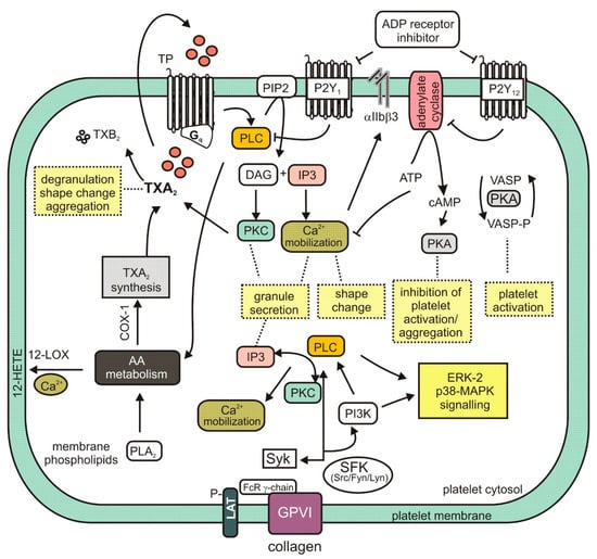 Such platelet activation affects the release of fibrinogen and P-selectin, together with various prothrombotic factors, such as thrombin, adenosine diphosphate (ADP) and TXA2. Mitogen-activated protein kinases (MAPKs), such as ERK-2, p38-MAPK and JNK-1, are also activated by agonist-stimulated platelets. It is suggested that collagen-induced activation of PI3K and PLC may be upstream events mediating ERK-2 and p38-MAPK phosphorylation [36,49,50,51].