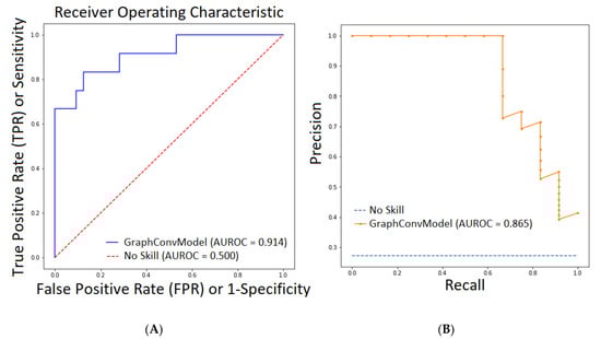 Figure 1 (left) plots the ROC curve using Sensitivity vs. 1-Specificity for different probability cutoffs to represent the model performance. It can be observed that our model was far from a no skill (random) model (AUROC = 0.5). In order to be more precise, we plotted the second graph with the PRC-AUC curve (see Figure 1, Right) that depicts the precision vs. recall for different probability cutoffs compared with the no skill (random) model. A no skill or random model for AUC curve means that the model was not able to increase the True Positive Rate (TPR) compared with False Positive Rate (FPR), thus maintaining TPR equal with FPR (it was not able to learn anything good, it predicted random values). In the case of PRC-AUC, a no skill or random model was the one that maintained the precision very low (more false positives) while increasing the recall values (less false negatives). Both AUROC and PRC-AUC scores demonstrated good performance of the GraphConvModel model with the test subset.