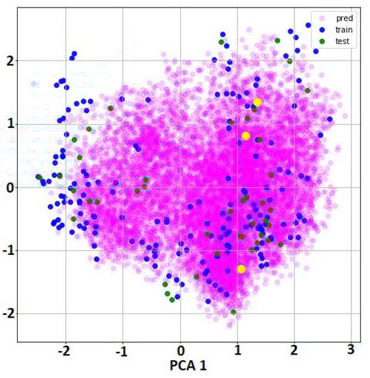 Two PCA components of the hidden features extracted by the GraphConvModel for training, test and prediction subsets. Green and blue marks correspond to the molecules used in training and test datasets for QSAR model construction. Purple marks correspond with all molecules used in virtual screening (DrugBank database) and yellow marks indicates the location of the best candidates obtained after molecular dynamic simulation: levothyroxine, amobarbital and ABP-700.