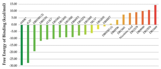 These top candidate molecules (see Table 2) were subject to molecular docking and molecular dynamics simulations. Among them, no possible binding mode was predicted for bismuth subcitrate potassium. The docking analysis of the remaining molecules leads to predicted complexes showing favorable ligand–receptor interactions and complementarity. The detailed results of the docking process are presented as Table S2 (Supplementary Materials). Among all predicted complexes, the best consensus docking score is obtained for Inositol nicotinate, followed by niceritrol, rebastinib, aleplasinin and liothyronine in the top five positions. On the other hand, the worst scored compounds are ortataxel, isoflurophate, nicotinic acid, aluminium nicotinate and amobarbital. Despite the fact that molecular docking is a widely used tool for virtual screening, the scoring functions used for these calculations neglect many important factors influencing molecular recognition and complexes’ stability in the sake of calculation speed. For this reason, the post-processing of the ligand–receptor complexes predicted with docking tools with more accurate methods based on the analysis of MD trajectories is recommended []. Such calculations allow for a better estimation of the free energy of binding of the ligands to the receptor. With this aim, MM-PBSA calculations were performed as described in the Material and Methods section. The predicted free energies of binding for the obtained docking complexes are summarized in Figure 3 and the detailed results are provided in Table S3 (Supplementary Materials).