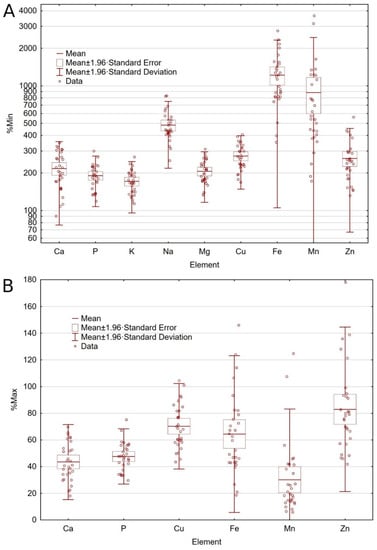 Amount of minerals in relation to the minimum recommended level (A) and maximum nutritional and maximum legal limit (B) contents according to European Pet Food Industry Federation (FEDIAF) [3].
