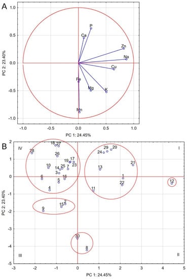 Biplot based on first two principal component axes for mineral composition of dog foods (A) and distribution of 30 commercial dog foods based on the first two components obtained from principal component analysis (B).