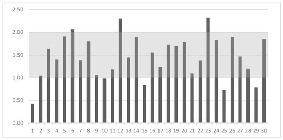 Calcium to phosphorus ratio (on Y-axis) in the 30 analyzed dry dog foods (on X-axis) and their comparison with nutritional guidelines [3] (gray area).