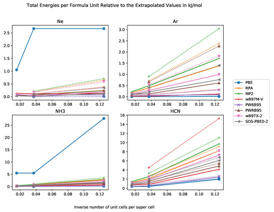 Total energies per formula unit relative to extrapolated total energy in kJ·mol−1 against inverse number of unit cells in supercell with basis sets of DZ and TZ quality for the systems Ne, Ar, NH3, HCN.