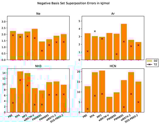 Negative Basis set superposition errors in kJ·mol−1 with basis sets of DZ and TZ quality for the systems Ne, Ar, NH3, HCN.