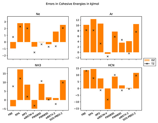 Errors in cohesive energies in kJ·mol−1 with respect to the experimental values with basis sets of DZ and TZ quality for the systems Ne, Ar, NH3, HCN.