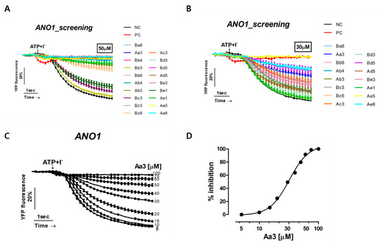 Identification of a novel inhibitor candidate of ANO1. The activity of ANO1, a Ca2+-activated Cl– channel, was assessed in Fischer rat thyroid yellow fluorescent protein (FRT-YFP) cells stably expressing ANO1. (A) The cells were pre-treated with 50 µM of 19-candidate compounds for 20 min, and ANO1 was activated by treating the cells with 100 µM of ATP, an agonist of P2Y receptor. (B) Fifteen-compounds, which were noteworthy, were selected. Subsequently, ANO1 activity was re-measured in a lower concentration of 30 µM. (C) The selected Aa3 compound inhibits the activity of ANO1 in a dose-dependent manner. (D) IC50-curve of Aa3 (mean ± S.E. n = 3). NC; negative control (DMSO-treated cells), PC; positive control (cells treated with NPPB known as a chloride channel inhibitor).