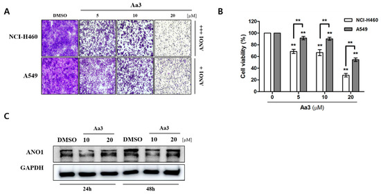 Anti-cancer effects of Aa3 in non-small cell lung carcinoma (NSCLC) cells expressing low level of ANO1 (A549) and in those expressing high levels of ANO1 (NCI-H460). Anti-proliferation effect of Aa3 in NCI-H460 (large cell carcinoma) and A549 (adenocarcinoma). To investigate the effects on ANO1 inhibition, NCI-H460 and A549 cells were seeded and treated with indicated concentrations of Aa3 for 48 h. (A) The cells were fixed and stained using crystal violet for cell viability analysis. (B) Cell proliferation was analyzed using WST-1 assay and Graphpad Prism 5 software (bars, mean ± S.E.; ** p < 0.01, n > 3). (C) The effect on the endogenous ANO1 protein levels was examined by western blotting.
